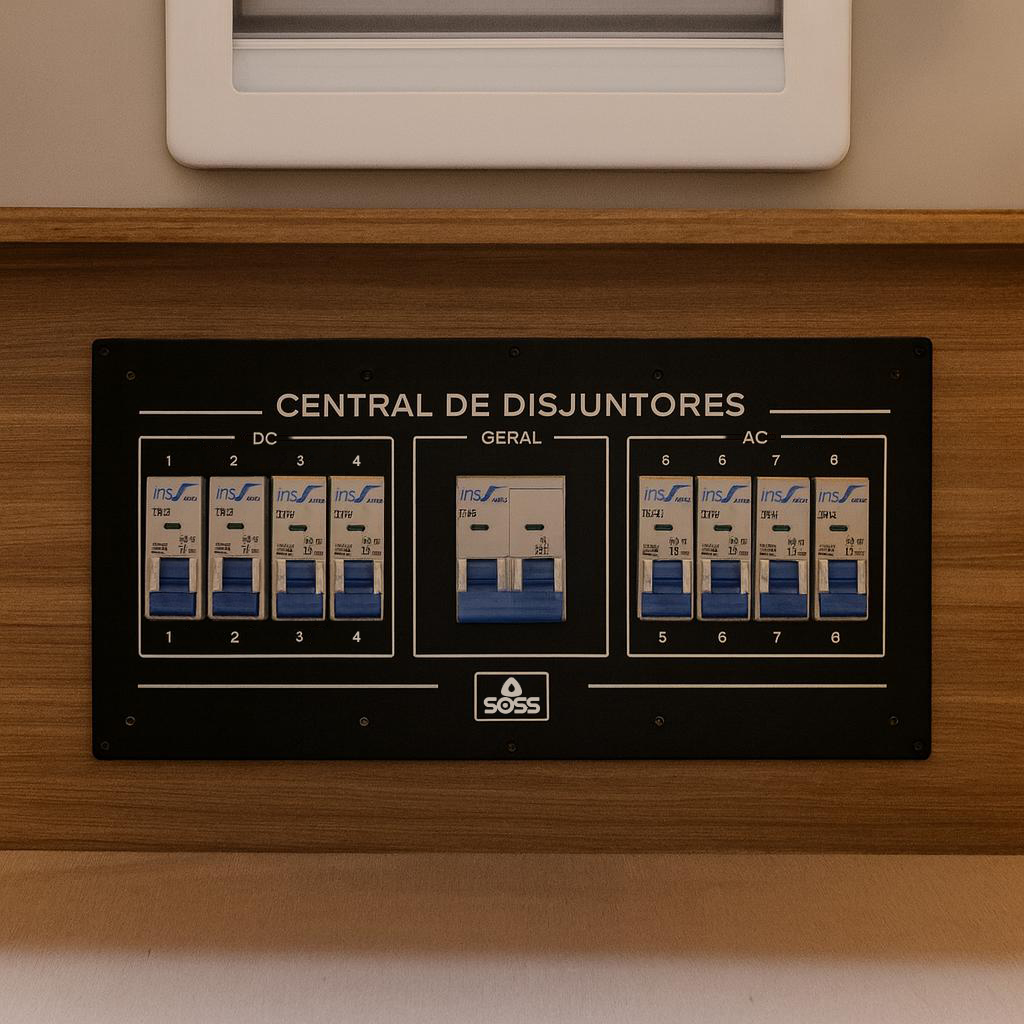Central de controle do sistema elétrico com 8 disjuntores e sistema com acionamento de chave geral para (Motorhome) (Van) (Ônibus) adequado para sistemas 12v e 24v, excelente para organização do quadro elétrico do seu veículo, prático, discreto e elegante, painel em chapa de aço pintado em preto pó, com acabamentos em acrílico. Sistema de corrente continua separados da corrente do sistema alternado.