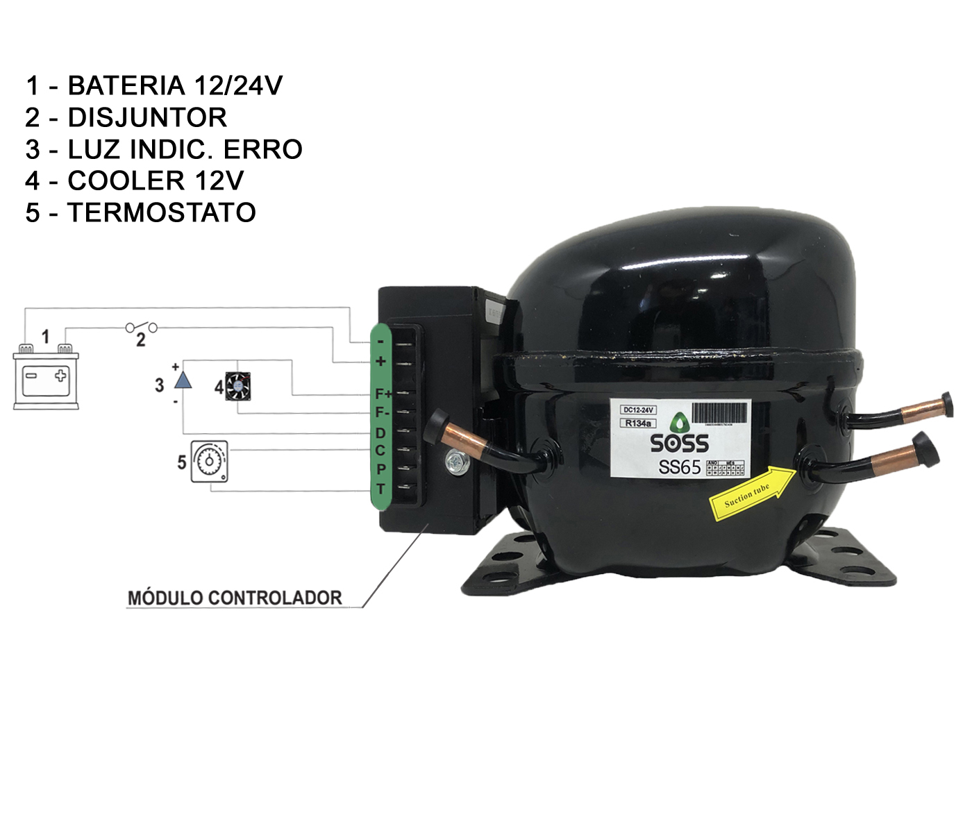 Compressor equipado com unidade eletrônica, com a função de proteção de bateria e saídas para ligação do ventilador do condensador.