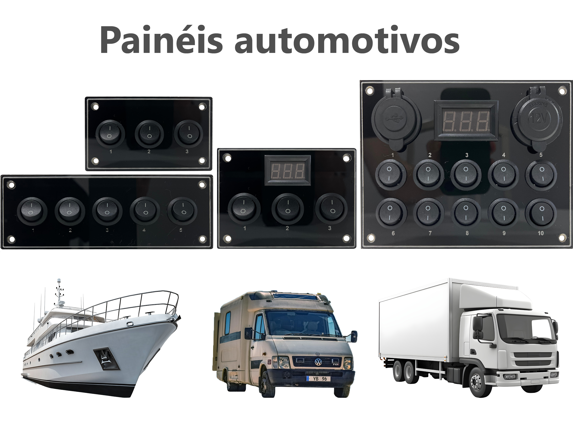 Com este painel, você pode facilmente controlar luzes, sistemas de som, bombas d’água, inversores, televisores e outros dispositivos eletrônicos do seu veículo. Tudo isso de maneira organizada e acessível.